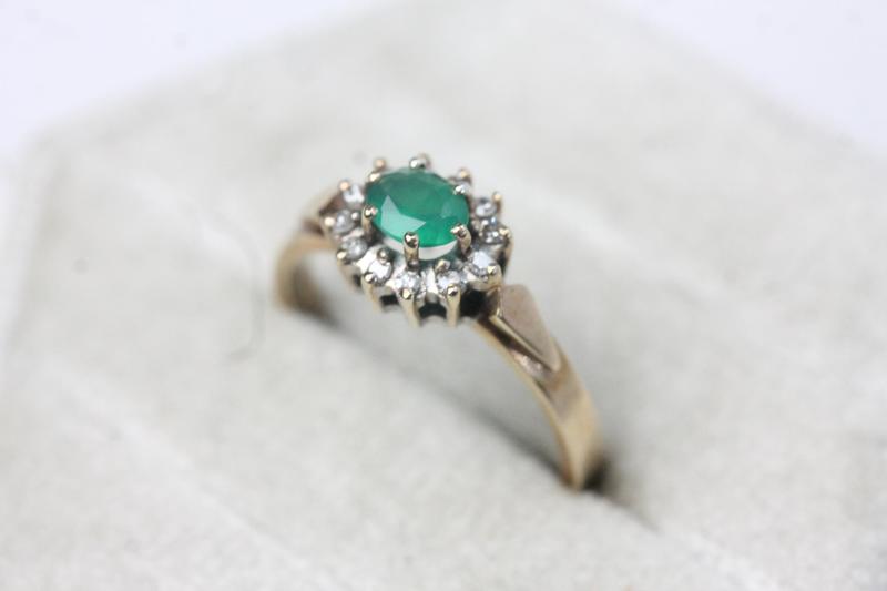 Lot 128 - 9CT GOLD GREEN & WHITE STONE RING £130