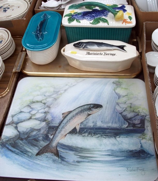 Lot 57 & 58 - Fish themed dishes and glass chopping board £32 |