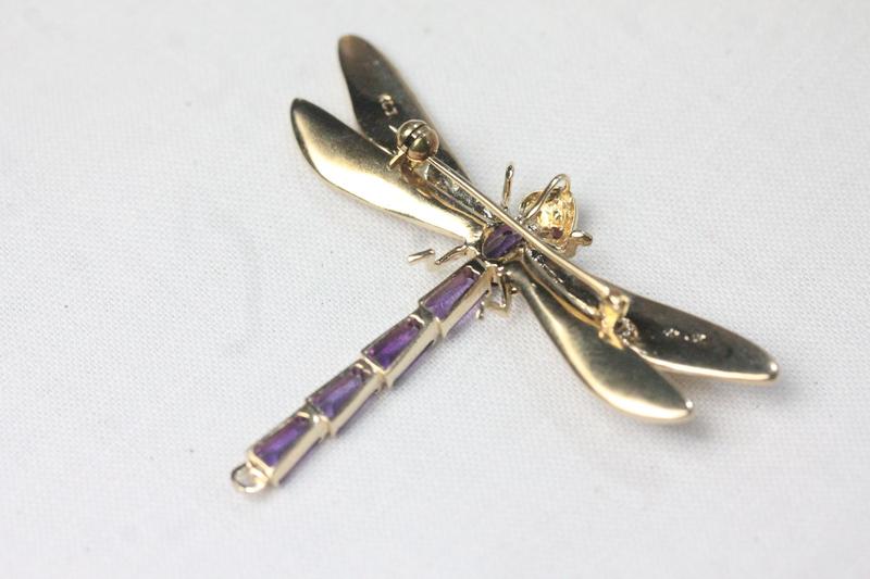 Lot 113 - 14CT GOLD AMETHYST DRAGONFLY BROOCH £220