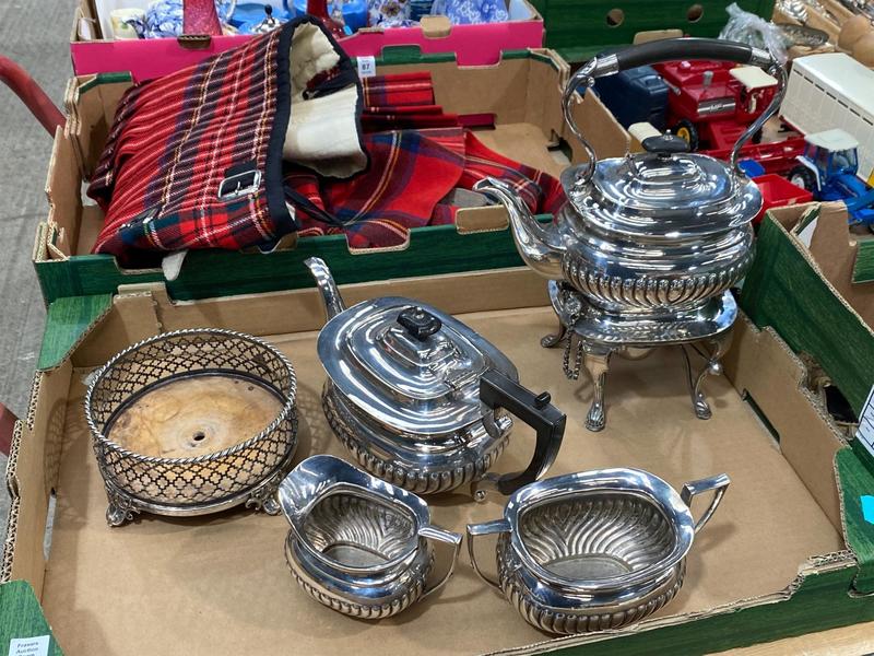 Lot 86 - PLATED TEA SERVICE INC SPIRIT KETTLE & C PLATED TEA SERVICE I £42