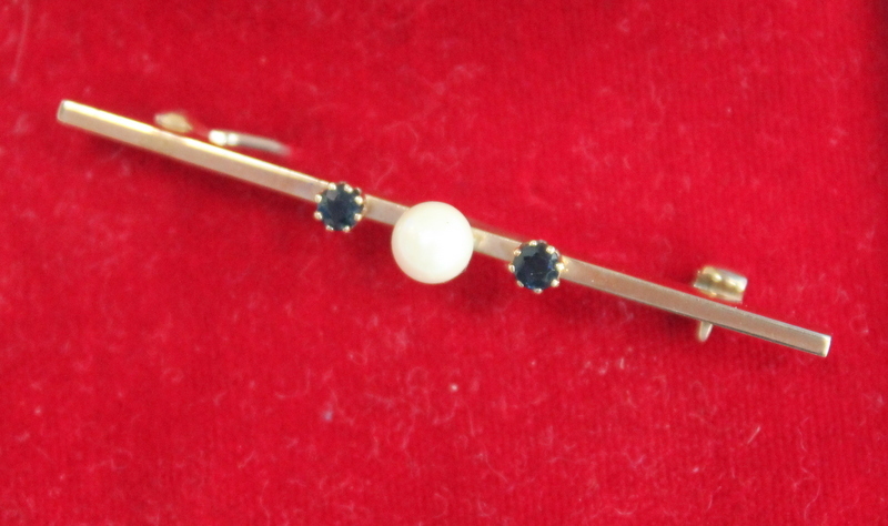 Lot 164 - 9ct Gold pearl & sapphire bar brooch £55