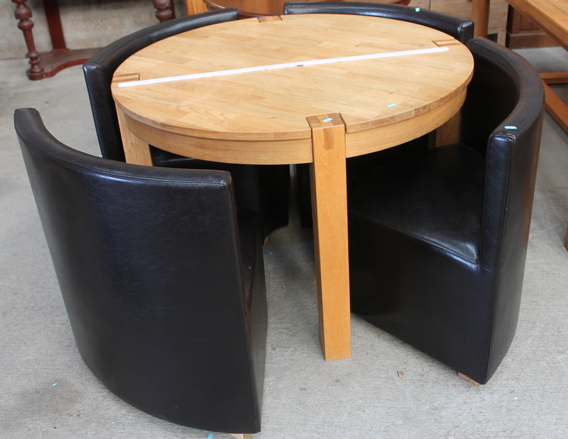 Lot 459 - Oak Circular Dining table & 4 Leather dining chairs £150