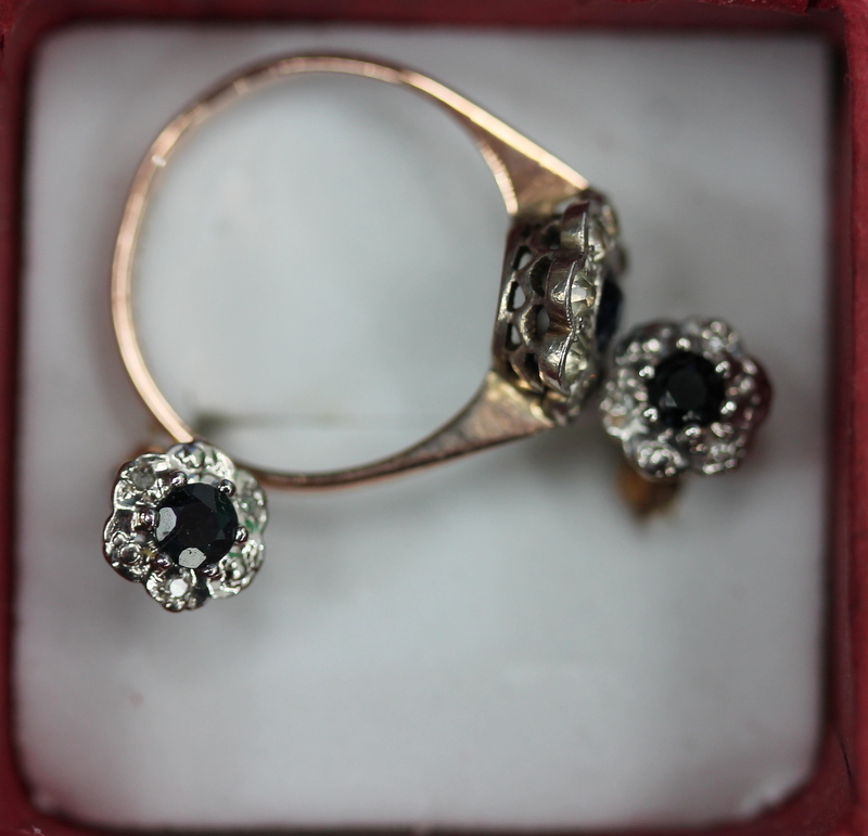 Lot 163 - 9ct Gold Platinum Sapphire & Diamond cluster ring & earrrings £65