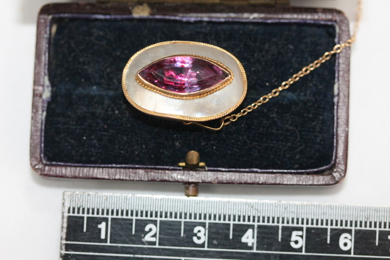 Lot 132 - 9ct Gold Amethyst & Mother of Pearl Brooch £90