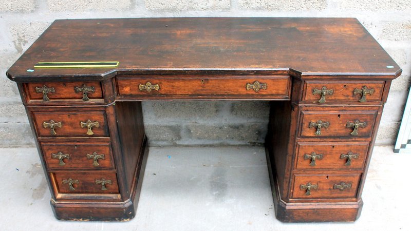 Lot 386 - Leather topped double pedestal yew effect desk £60