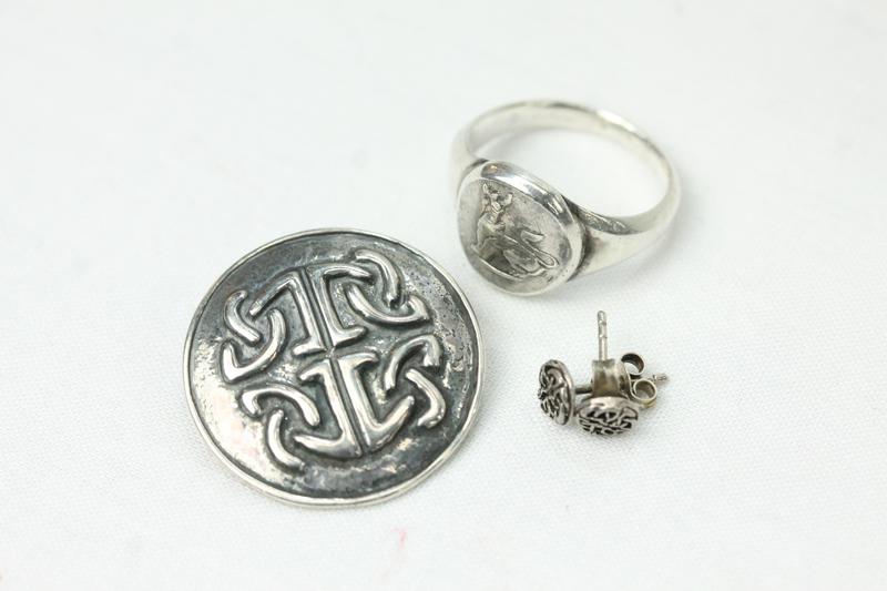 Lot 129 - SILVER & CELTIC KNOTWORK BROOCH, RING & £20