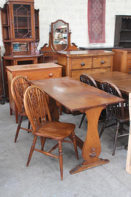 Lot 351 - OAK REFECTORY STYLE TABLE & 2 WHEEL BACK £28