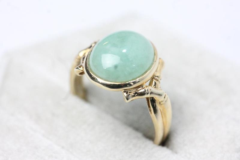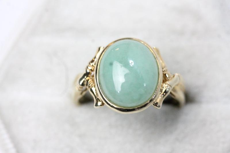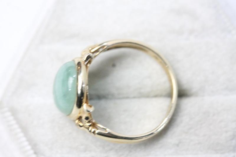 Lot 109 - 14CT GOLD GREEN CABOCHON STONE RING (O) £220