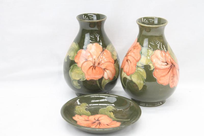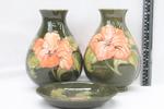 Lot 24 - MOORCROFT 'HIBISCUS ON GREEN' PLATE & 2 VASES