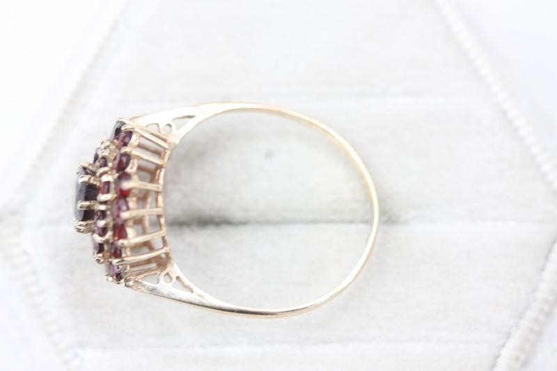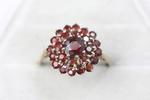 Lot 117 - 9CT GOLD, RED STONE CLUSTER RING (R-S)
