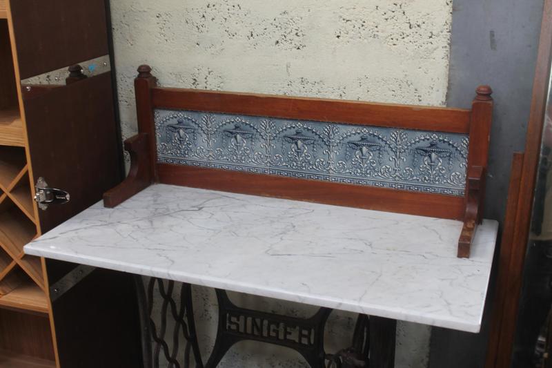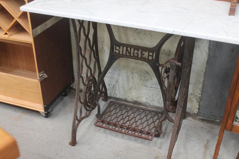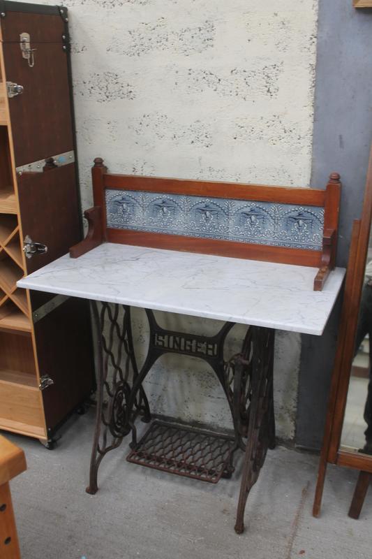 Lot 383 - MARBLE TOP WASHSTAND ON SINGER TREADLE BASE
